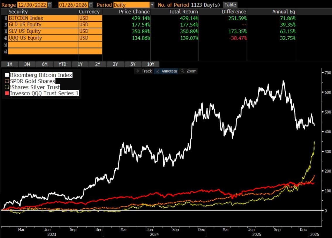 Theo chuyên gia ETF Eric Balchunas, sự bi quan xoay quanh diễn biến gần đây của Bitcoin khi đặt cạnh vàng và bạc là cách nhìn “hết sức thiển cận”. Trong một bài đăng trên X hôm thứ Bảy, ông nhấn mạnh rằng Bitcoin đã vượt trội rõ rệt trong suốt hai năm 2023–2024, nhưng dường như nhiều người đã nhanh chóng quên mất điều này.