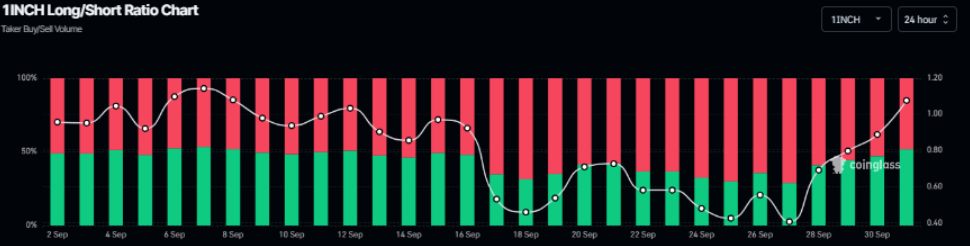 Ở mảng phái sinh, tâm lý lạc quan cũng ngày càng rõ nét. Biểu đồ từ CoinGlass ghi nhận tỷ lệ long/short của 1INCH đạt 1,08 vào hôm thứ Tư, tiệm cận mức đỉnh tháng, phản ánh kỳ vọng tăng giá đang chiếm ưu thế trong cộng đồng trader.