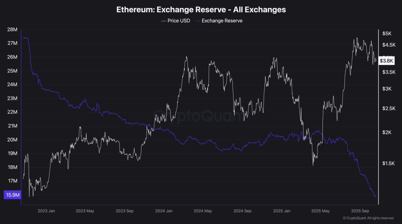 Cùng lúc đó, lượng ETH trên các sàn giao dịch tiếp tục giảm mạnh, chỉ còn 15,9 triệu ETH — mức thấp nhất trong hơn ba năm.