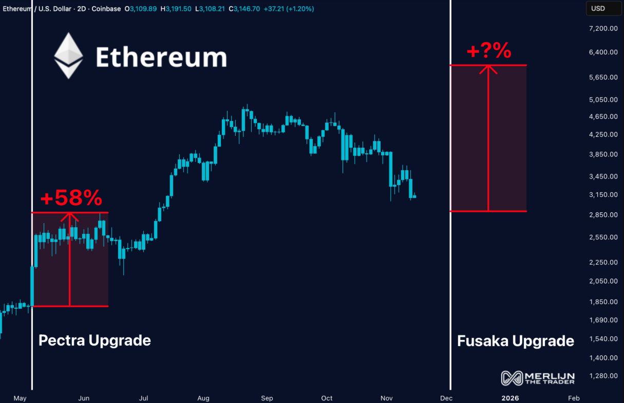 Trong lịch sử, mỗi đợt nâng cấp lớn đều đóng vai trò như một chất xúc tác đáng kể. Đơn cử như Pectra, bản nâng cấp trước đó từng trùng với cú tăng 58% của ETH. Lần này, Fusaka được kỳ vọng còn tạo ra những cải tiến sâu rộng hơn, từ giảm chi phí gas đến gia tăng thông lượng L2 — hai yếu tố trực tiếp củng cố mức độ sử dụng và hoạt động trên mạng lưới Ethereum.