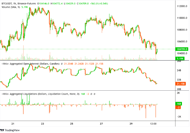 Hợp đồng mở (OI) trên thị trường tương lai của Bitcoin đã bị xóa sổ 3,7 tỷ USD khi giá BTC giảm từ $108.000 xuống còn $104.500. Điều này có thể được coi là sự thiết lập lại thị trường lành mạnh, vì nó phản ánh việc thanh lý các vị thế đòn bẩy quá mức, làm giảm sự hưng phấn của thị trường.