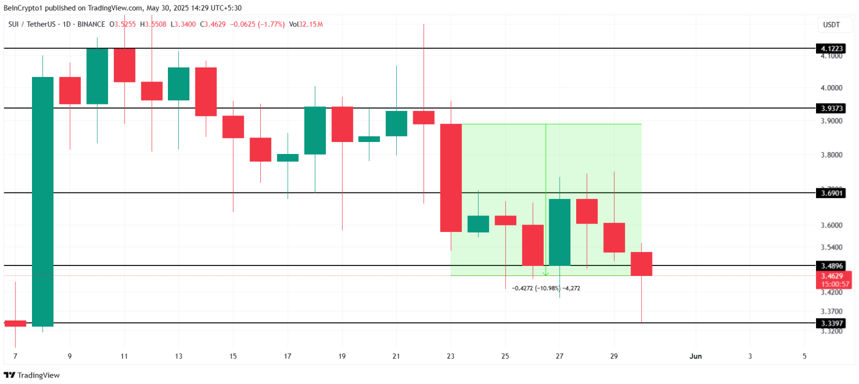 Sui (SUI) đã bật lên từ đường SMA 50 ngày ($3,30) vào ngày 30/5, cho thấy các mức giá thấp vẫn đang thu hút lực mua.