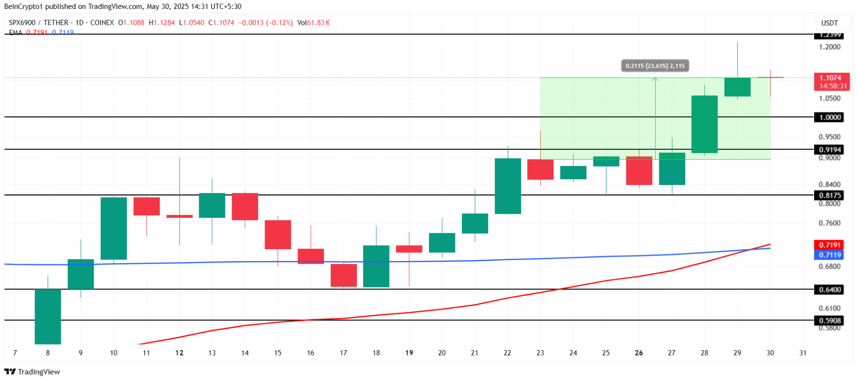 Dù là một meme coin vốn nổi tiếng với độ biến động cao, SPX lại đang phát tín hiệu kỹ thuật tích cực. Các đường trung bình động hàm mũ (EMA) đang tiệm cận hình thành mô hình “Golden Cross” — một chỉ báo tăng giá cổ điển, mở ra khả năng tiếp tục leo dốc và thậm chí có thể bứt phá ngưỡng kháng cự quan trọng tại $1,23 trong ngắn hạn.