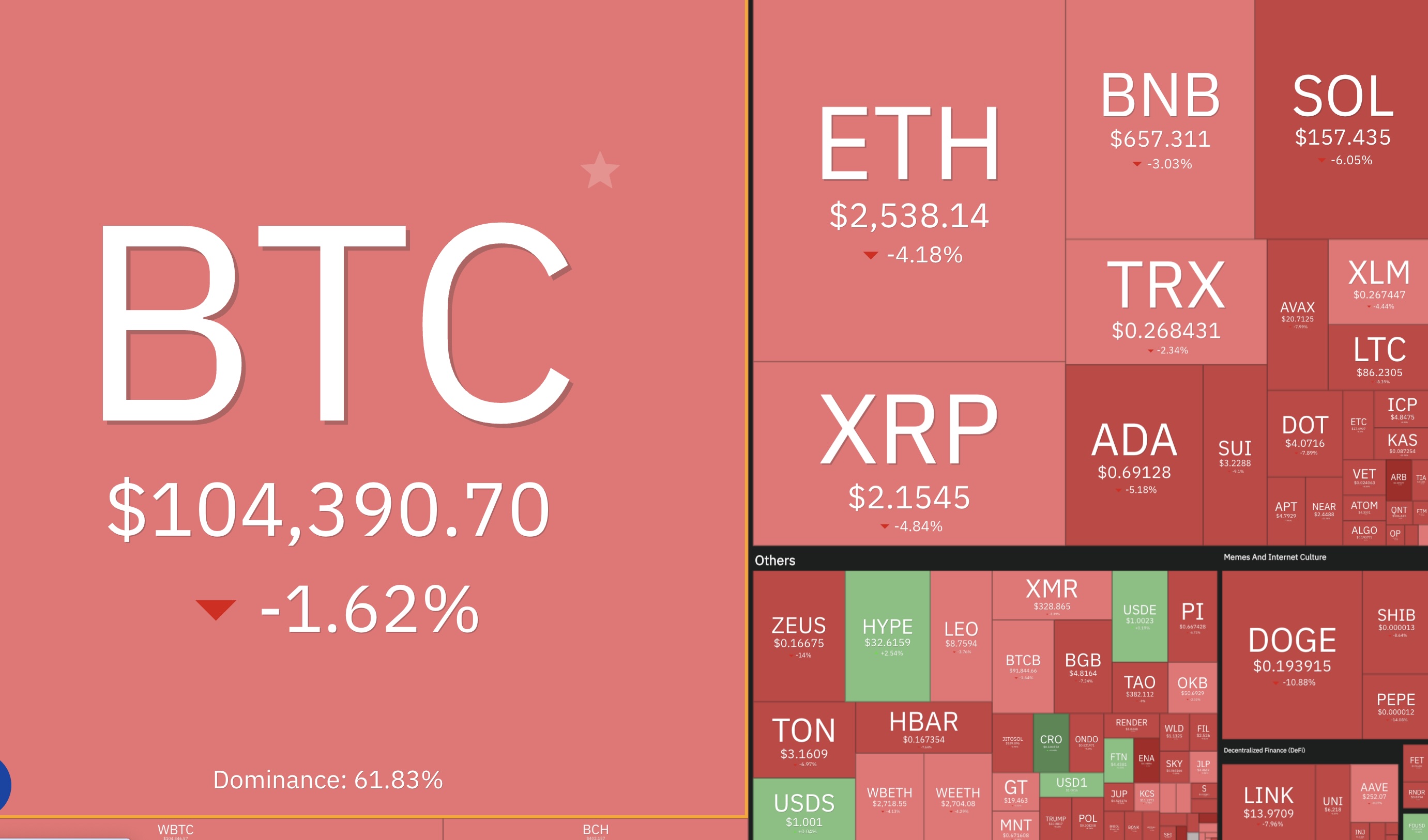 Bitcoin giảm 1,62%, hiện giao dịch quanh mức 104.000 USD, sau khi có lúc chạm đáy phiên ở 103.900 USD. Chỉ số CoinDesk 20 – đại diện cho 20 tài sản tiền điện tử lớn nhất (không bao gồm stablecoin, memecoin và coin sàn) – còn giảm mạnh hơn, mất 4,2% giá trị.