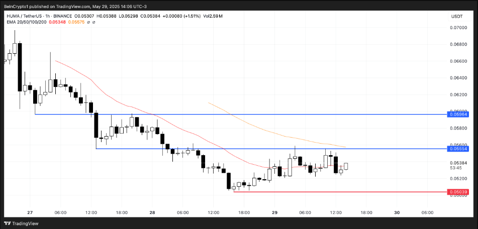 Kể từ đợt airdrop, giá HUMA đã giảm hơn 51% chỉ trong ba ngày, phản ánh tình trạng thiếu hỗ trợ từ người mua. Nếu xu hướng giảm hiện tại tiếp tục, giá có thể trượt xuống dưới $0,0503, kiểm tra mức đáy mới.
