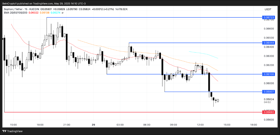 SOPH hiện đang dao động gần mức hỗ trợ quan trọng $0,056, mức này có thể sớm bị phá vỡ nếu áp lực bán tiếp tục gia tăng.