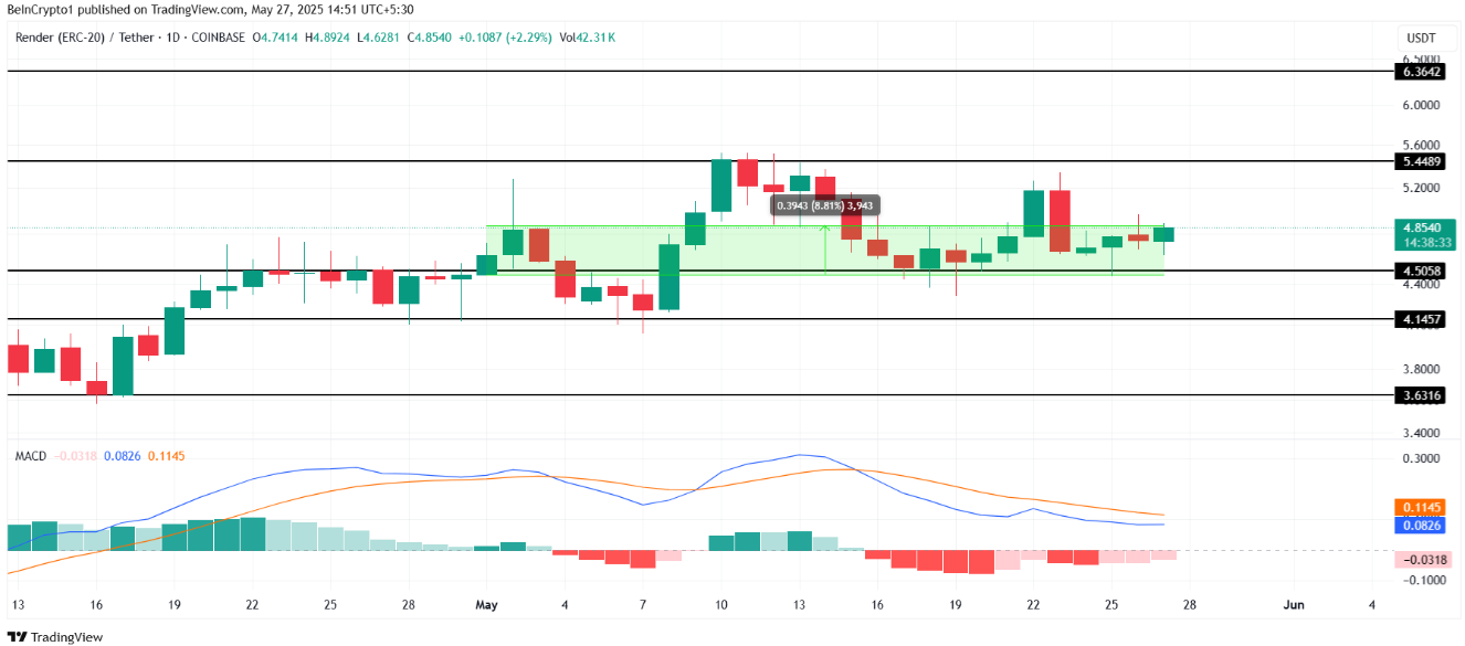 Chỉ báo MACD cho thấy RNDR đang tiến gần đến điểm giao cắt tăng giá, báo hiệu khả năng tiếp tục tăng trưởng. Nếu báo cáo lợi nhuận hỗ trợ thêm cho động lực, token AI này có thể tăng lên mức 5,44 đô la. Vượt qua ngưỡng kháng cự này sẽ mở ra cơ hội tiến tới 6,36 đô la, đánh dấu một bước tăng đáng kể.
