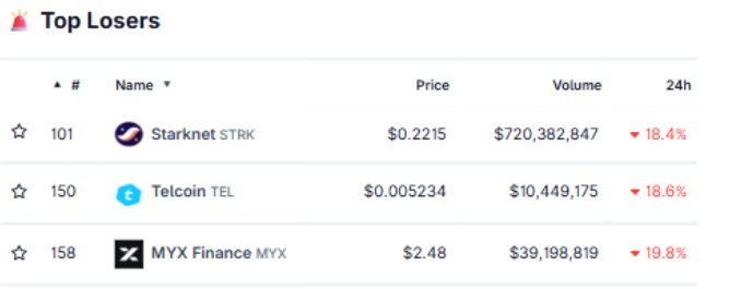 Starknet (STRK), Telcoin (TEL) và MYX Finance (MYX) tiếp tục đối mặt với áp lực bán mạnh trong ngày thứ Sáu, sau khi Bitcoin (BTC) lao xuống dưới mốc 86.000 USD và kéo theo đà giảm chung của nhóm altcoin vốn hóa nhỏ. Dữ liệu từ CoinGecko cho thấy STRK, TEL và MYX đều giảm hơn 18% trong 24 giờ qua.