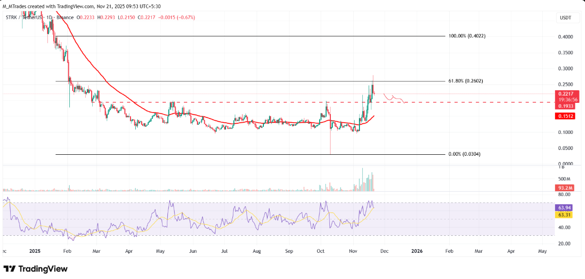 Giá Starknet đã quay lại kiểm định mức Fibonacci thoái lui 61,8% tại 0,26 USD (được đo từ đỉnh ngày 21/1 ở 0,40 USD xuống đáy tháng 10 tại 0,03 USD) vào ngày thứ Tư, trước khi giảm mạnh 10,36% trong phiên kế tiếp. Tính đến chiều thứ Sáu, STRK tiếp tục đi xuống và đang giao dịch quanh mốc 0,22 USD.