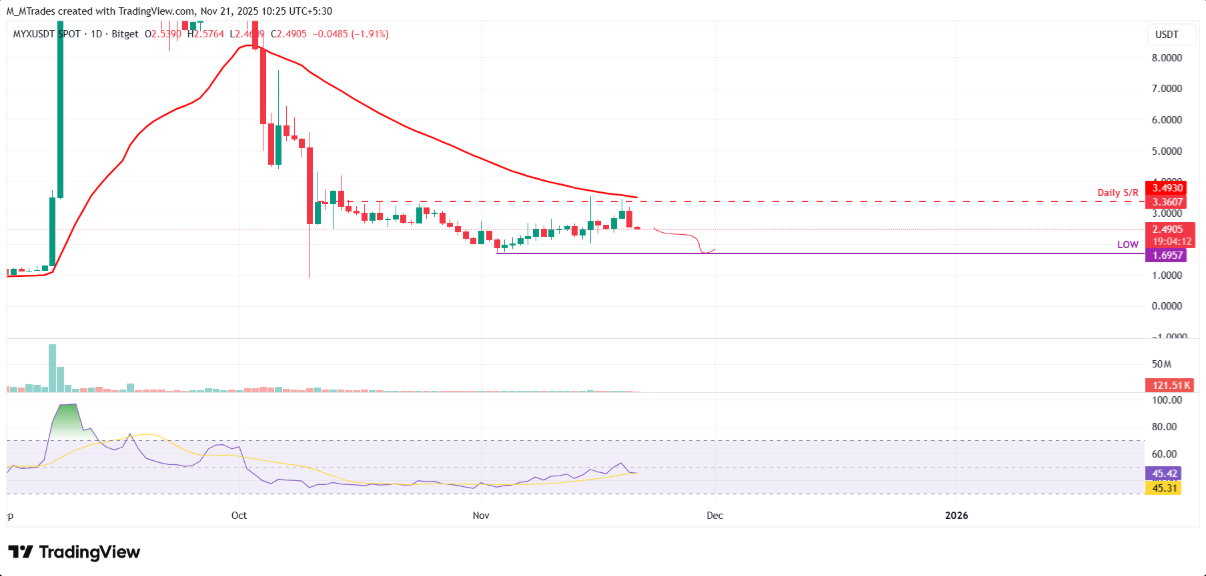 Giá MYX Finance đã bị từ chối mạnh tại đường EMA 50 ngày ở mức 3,49 USD vào ngày thứ Tư, kéo theo mức giảm 17% trong phiên kế tiếp. Đáng chú ý, đường EMA 50 ngày gần như trùng khớp với vùng kháng cự quan trọng quanh 3,36 USD, tạo nên một cụm kháng cự mạnh. Tính đến chiều thứ Sáu, MYX tiếp tục giao dịch trong sắc đỏ, dao động quanh mức 2,49 USD.