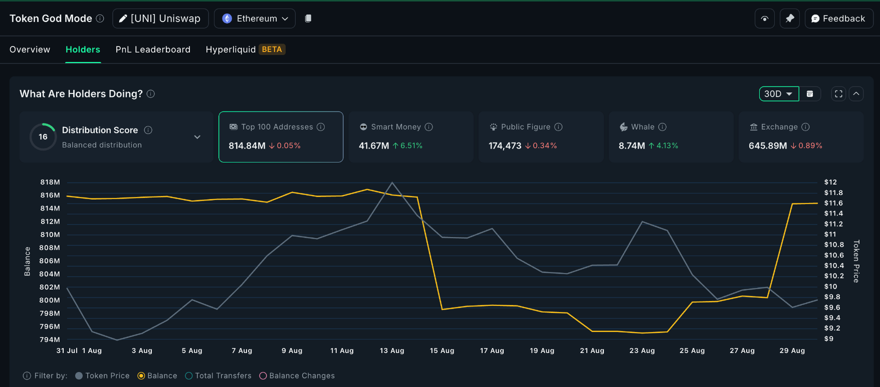 Trong 30 ngày qua, lượng nắm giữ UNI của tiền thông minh đã tăng 6,51%, đưa tổng số token họ sở hữu lên 41,67 triệu UNI. Với mức giá UNI hiện tại là 9,77 đô la, điều này tương đương với lượng mua khoảng 24,9 triệu đô la.