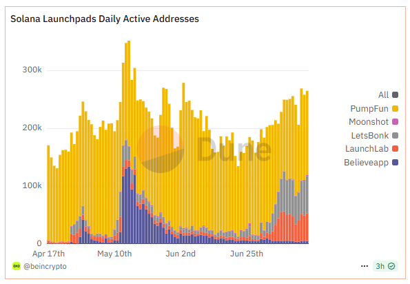 Từ dữ liệu của Dune, chúng ta cũng thấy rằng số lượng địa chỉ hoạt động trên các nền tảng Solana Launchpad đã vượt qua con số 260.000, tăng trưởng mạnh mẽ 60% so với tháng trước. Đây là dấu hiệu rõ ràng cho thấy sự quan tâm lớn từ cộng đồng đối với các dự án meme coin, đặc biệt là trên nền tảng blockchain nổi bật như Solana.