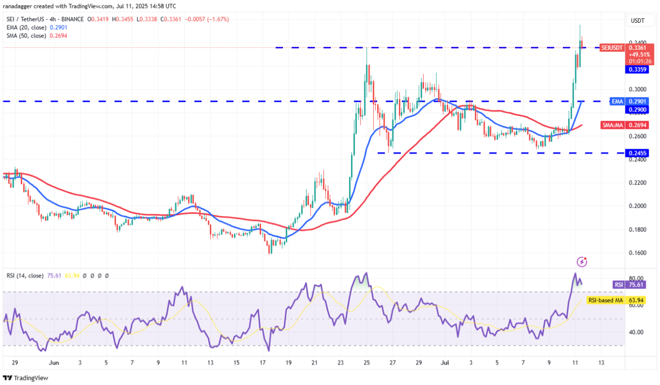 Sei (SEI) đã bật tăng mạnh từ đường EMA 20 ngày ($0,26) vào thứ Năm và hiện đã chạm ngưỡng kháng cự phía trên tại $0,34.