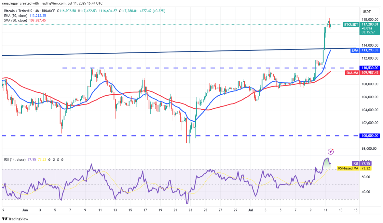 Hiện tại, giá đã bật mạnh từ vùng $110.530 và bứt phá lên trên đường viền cổ. Đà tăng này đã đẩy chỉ số sức mạnh tương đối (RSI) trên khung 4 giờ vào vùng quá mua – làm tăng khả năng điều chỉnh hoặc tích lũy ngắn hạn. Nếu giá duy trì trên đường viền cổ, xu hướng tăng có thể tiếp diễn đến vùng $123.000.