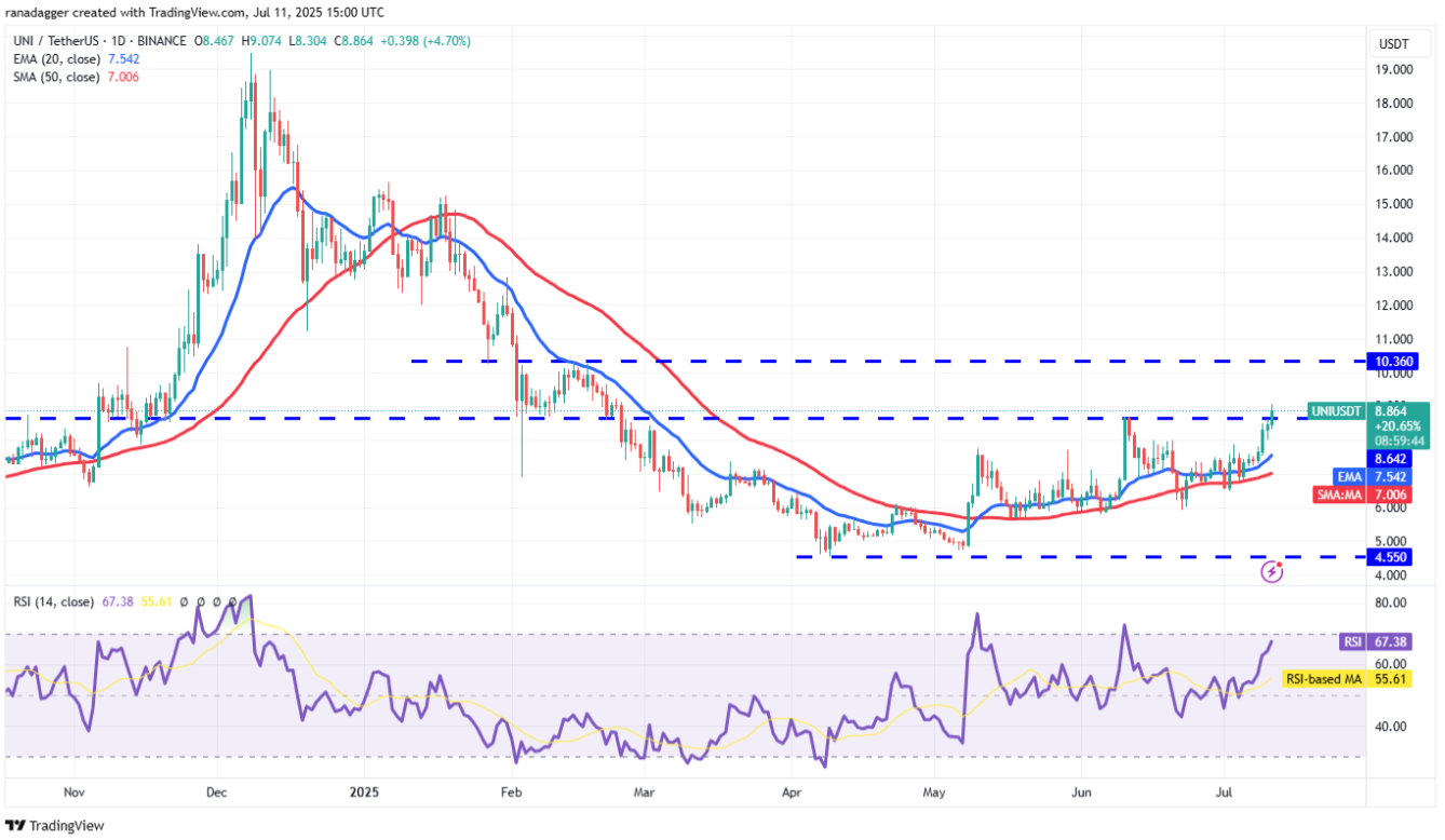 Cả hai đường trung bình động đều đang dốc lên, trong khi chỉ số RSI nằm trong vùng tích cực, cho thấy phe bò đang chiếm ưu thế. Mặc dù có kháng cự tại mốc $8,64, nhưng nếu giá đóng cửa vượt qua ngưỡng này, đợt tăng có thể mở rộng lên mức $10,36. Phe gấu có thể sẽ cố gắng chặn đà tăng tại $10,36, nhưng nếu phe bò không để giá rơi xuống dưới $8,64 trong quá trình điều chỉnh, cặp UNI/USDT hoàn toàn có thể tăng vọt lên $13.