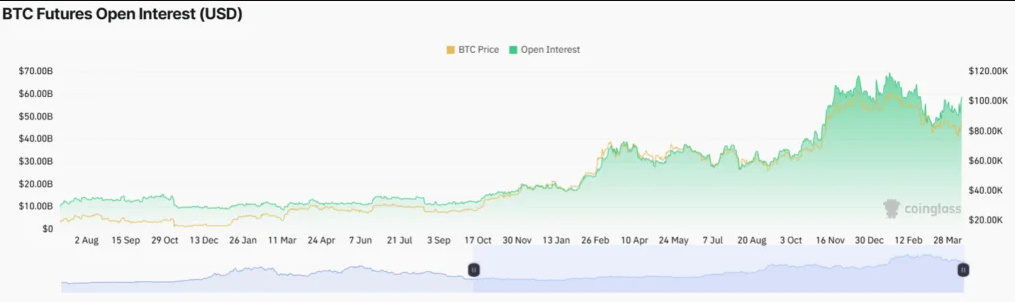 Trong 30 ngày qua, lãi suất mở (OI) của hợp đồng tương lai Bitcoin đã tăng 30%, từ 45 tỷ USD lên 58 tỷ USD. Sự gia tăng này thường là dấu hiệu báo trước cho nhu cầu tăng về Bitcoin. Dữ liệu từ Coinglass ghi nhận rõ sự gia tăng này từ ngày 12 tháng 3 đến ngày 13 tháng 4.