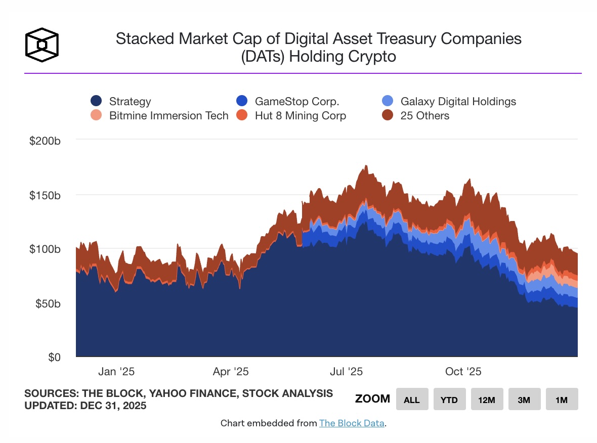 Tổng vốn hóa thị trường của các DAT dẫn đầu giảm 46%, từ đỉnh 176 tỷ USD xuống 94 tỷ USD trong năm 2025, mặc dù một số miner Bitcoin đa dạng hóa AI vẫn đạt hiệu suất vượt trội.