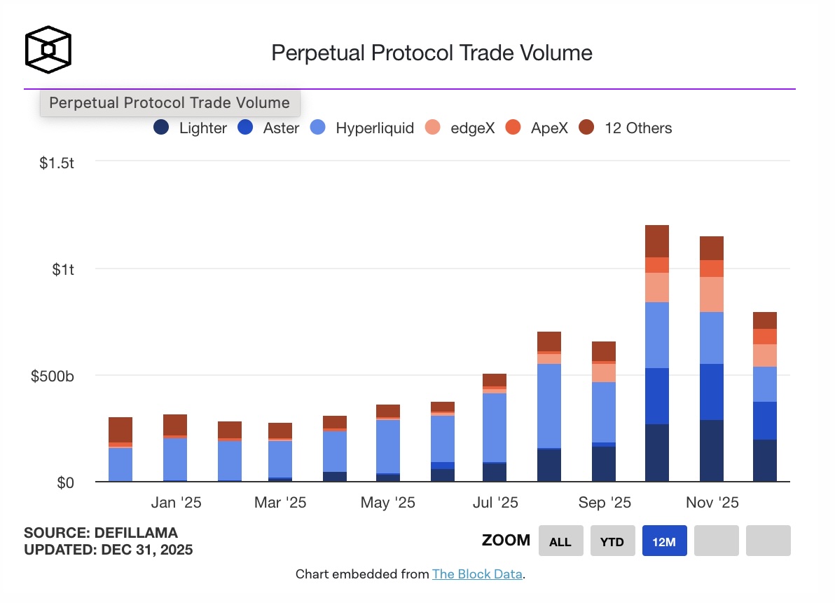 Ethereum-based Lighter nổi lên là đối thủ Hyperliquid mới, huy động 68 triệu USD với định giá 1,5 tỷ USD, triển khai giao dịch spot ETH trước khi phát hành token LIT. Khối lượng giao dịch perp protocol vượt 1.000 tỷ USD trong tháng 10, với Hyperliquid chiếm 308,5 tỷ USD, Lighter 272,5 tỷ USD và Aster 259,9 tỷ USD. Trong tháng 11, Lighter vượt hai đối thủ, dẫn đầu đến hết tháng 12.