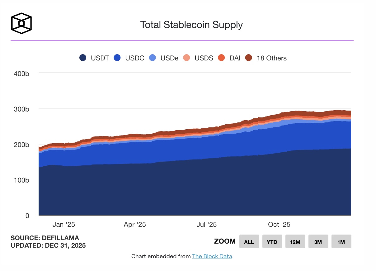 Việc áp dụng stablecoin bùng nổ trong năm 2025 nhờ các công ty thanh toán lớn, sự rõ ràng về quy định theo GENIUS Act và cơ sở hạ tầng blockchain mới, với tổng nguồn cung stablecoin gắn với USD trên các blockchain đạt gần 300 tỷ USD.