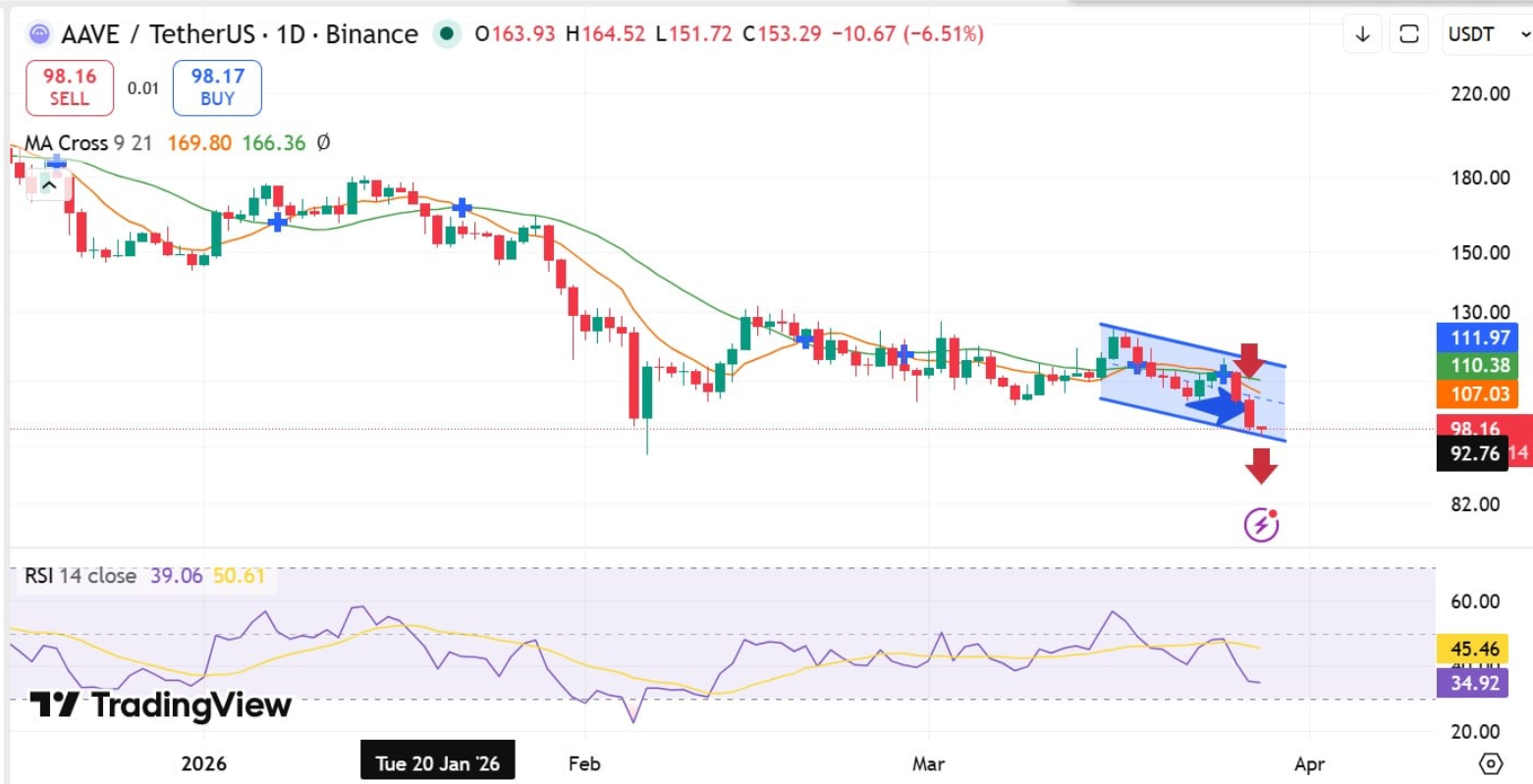 Aave đã đánh mất ngưỡng hỗ trợ quan trọng $100 trong bối cảnh thị trường chung suy yếu, kéo giá lao dốc về mức thấp nhất trong ba tuần tại $96. Tại thời điểm viết, AAVE giao dịch quanh $97, giảm 7,7% trong ngày, đồng thời vốn hóa thị trường cũng “bốc hơi” hơn 200 triệu USD.
