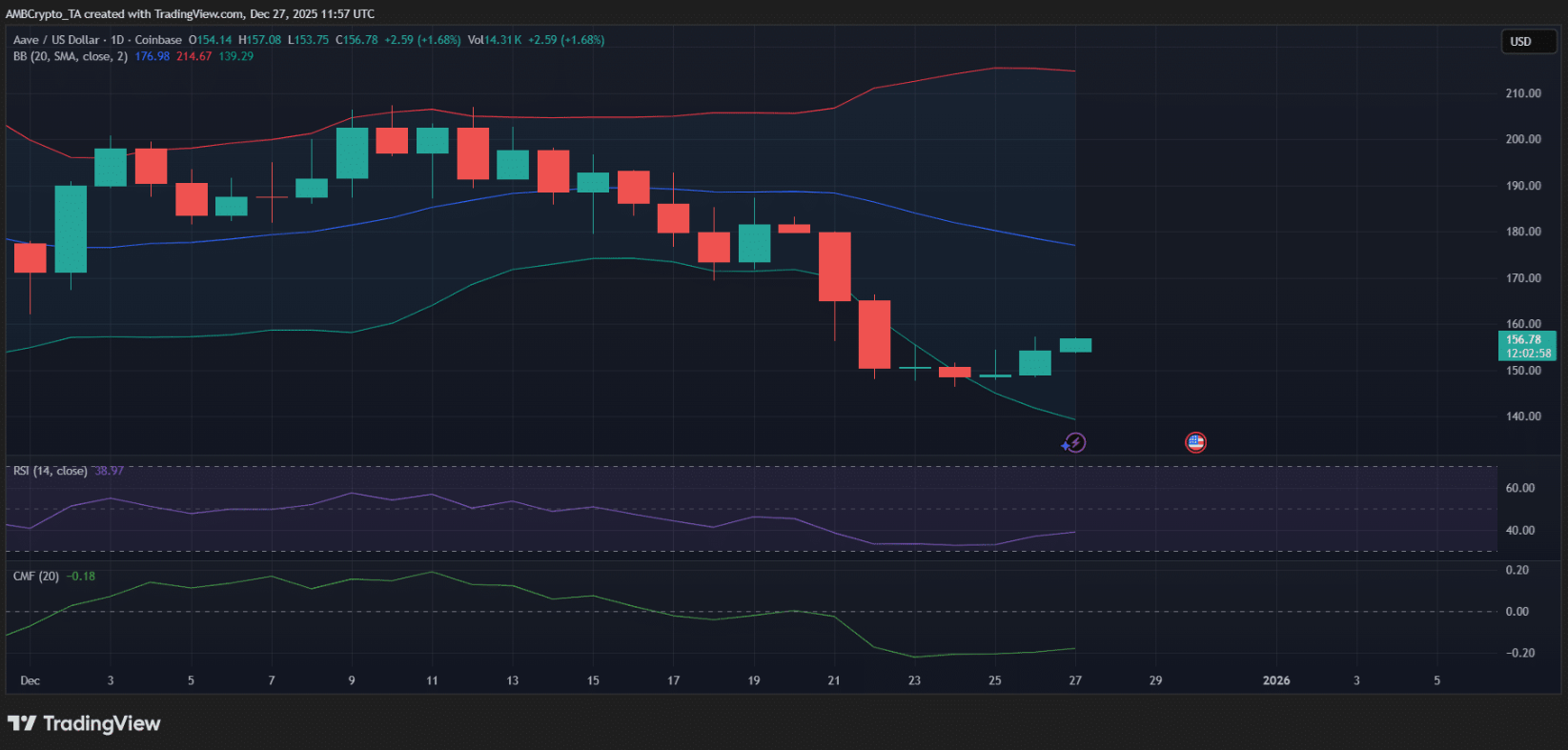 Sau nhịp lao dốc mạnh hồi đầu tháng, altcoin này đã có thời điểm xuyên thủng mốc 150 USD trước khi ghi nhận lực hồi phục khiêm tốn. Tại thời điểm viết bài, AAVE vẫn giao dịch bên dưới các đường trung bình động (MA) quan trọng — một dấu hiệu kỹ thuật cho thấy phe gấu vẫn đang chiếm ưu thế trên thị trường.