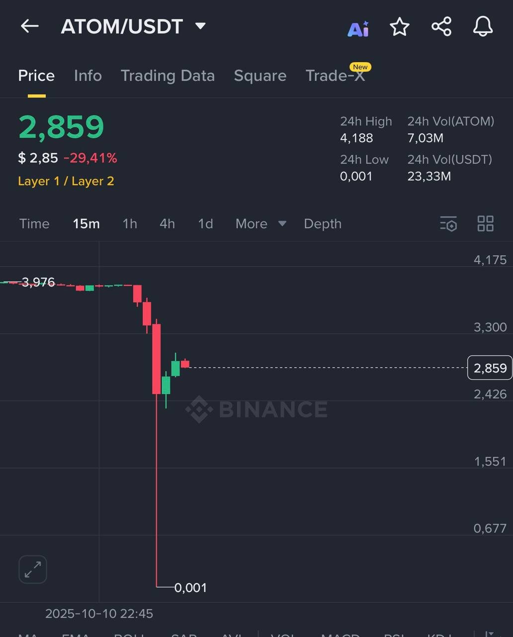 Ngòi nổ cho cơn hoảng loạn là sự kết hợp nguy hiểm giữa các yếu tố vĩ mô: căng thẳng thương mại và các tiêu đề về thuế quan đã kích hoạt làn sóng “risk-off”. Chỉ trong vòng một giờ, Bitcoin lao dốc khoảng 13%, trong khi các altcoin chịu tổn thất nặng nề hơn. Một số đồng, như ATOM, thậm chí rơi gần về 0 trên các sàn giao dịch kém thanh khoản trước khi phục hồi một phần.
