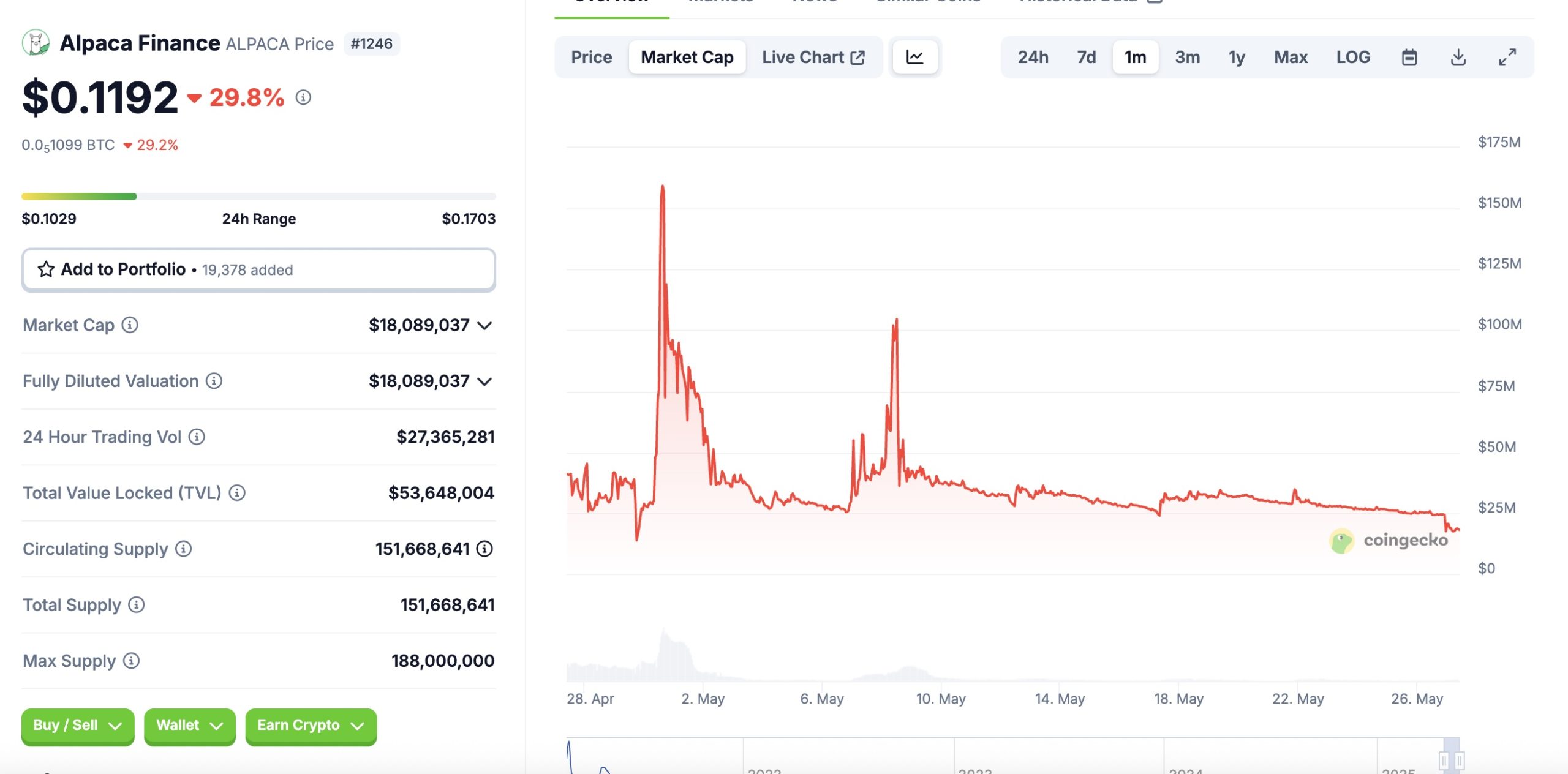 Giá token ALPACA đã giảm 30% chỉ trong 24 giờ qua, phản ánh tâm lý tiêu cực của thị trường trước tin đóng cửa.