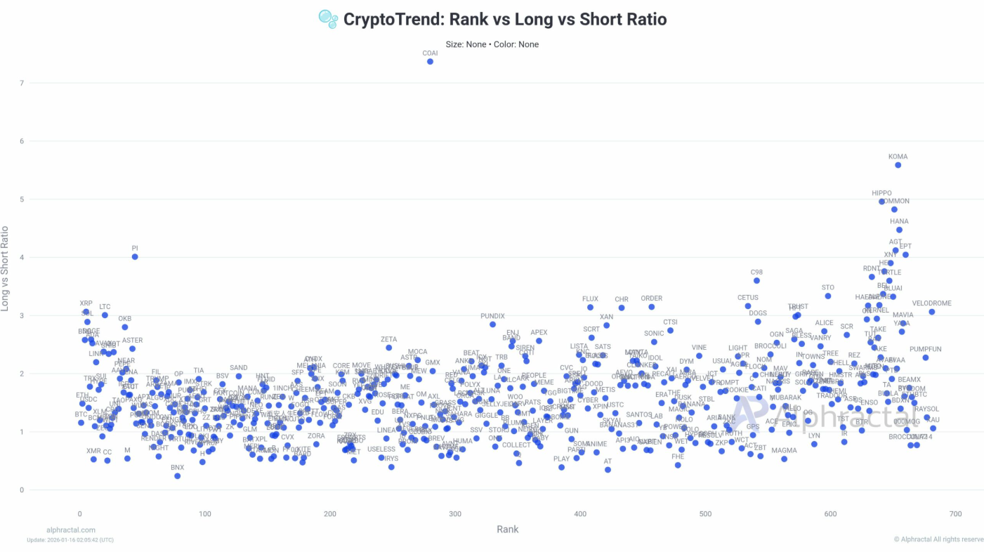 Trong một bài đăng trên nền tảng X, nền tảng phân tích Alphractal cảnh báo rằng tỷ lệ long/short của phần lớn altcoin đều vượt mốc 1, cho thấy phe bò đang trở nên “quá đông”. Đặc biệt, XRP ghi nhận tỷ lệ long/short lên tới 3,06 — mức được đánh giá là “cao bất thường”, làm gia tăng rủi ro biến động mạnh và áp lực chốt lời đối với các tài sản vốn hóa lớn.