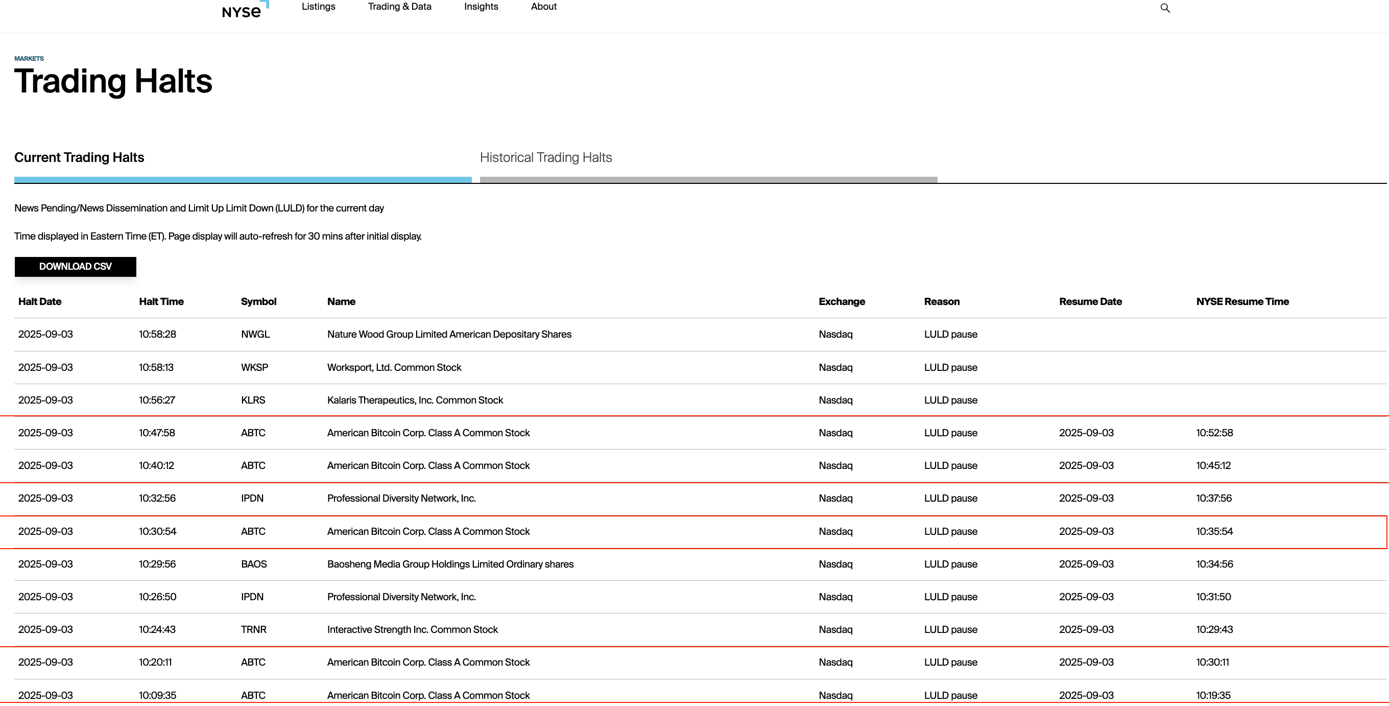 Nasdaq đã 5 lần tạm ngừng giao dịch cổ phiếu American Bitcoin (ABTC) vào ngày thứ Tư sau khi biến động tăng vọt trong phiên tái niêm yết của công ty.