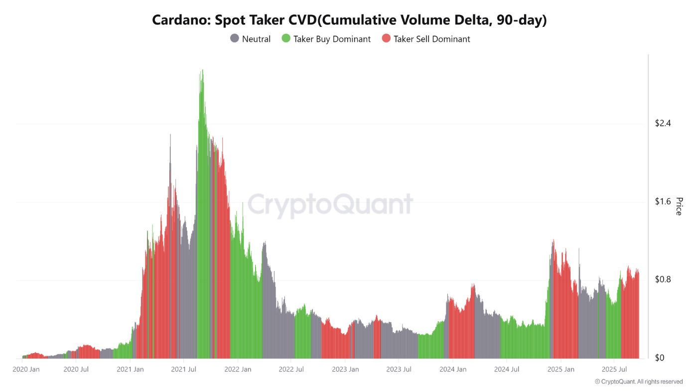 Không dừng lại ở đó, số liệu từ CryptoQuant cũng cho thấy áp lực bán ngày càng rõ rệt. Chỉ báo Taker CVD (Cumulative Volume Delta) của ADA đã chuyển sang trạng thái âm từ giữa tháng 8 và liên tục lao dốc. Đây là chỉ báo đo lường chênh lệch tích lũy giữa khối lượng mua và bán trong ba tháng. Khi CVD 90 ngày duy trì mức dương và đi lên, thị trường phản ánh giai đoạn phe bò chiếm ưu thế (Taker Buy Dominant Phase). Ngược lại, giá trị âm kèm xu hướng giảm cho thấy phe gấu đang nắm quyền kiểm soát (Taker Sell Dominant Phase).