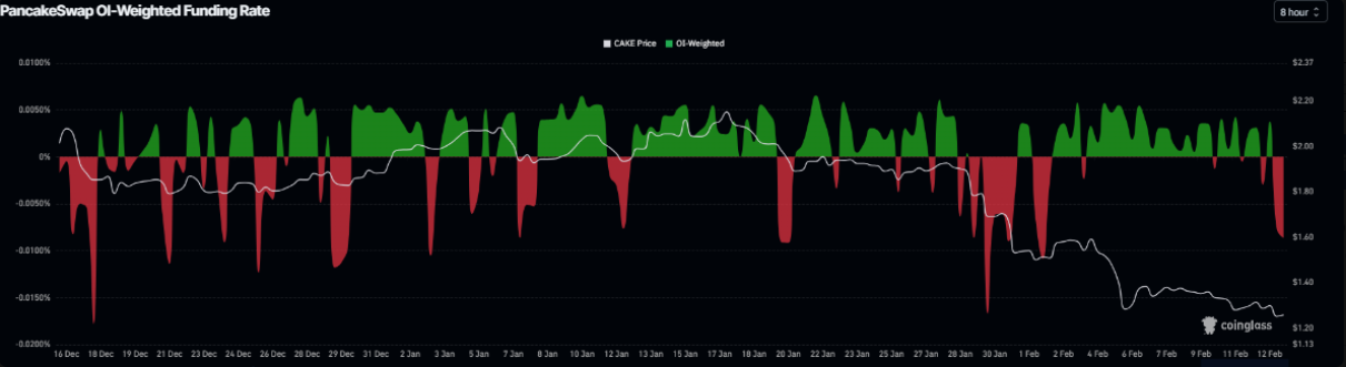 Dữ liệu từ thị trường phái sinh đang nghiêng về kịch bản tiêu cực đối với PancakeSwap. Theo chỉ số OI-Weighted Funding Rate do Coinglass công bố, số lượng trader đặt cược vào khả năng giá CAKE tiếp tục lao dốc hiện chiếm ưu thế so với nhóm kỳ vọng phục hồi.