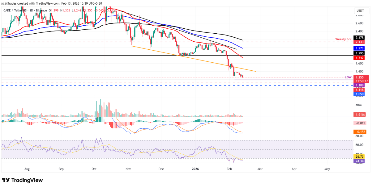 PancakeSwap (CAKE) đang chịu áp lực bán mạnh khi lùi xuống dưới ngưỡng 1,26 USD tại thời điểm ghi nhận vào thứ Bảy, qua đó nối dài chuỗi giảm hơn 8% trong tuần. Diễn biến kém tích cực trên thị trường phái sinh càng củng cố tâm lý bi quan, khi lực bán tiếp tục gia tăng và phe gấu đang hướng mục tiêu phá vỡ vùng hỗ trợ 1,18 USD trong ngắn hạn.