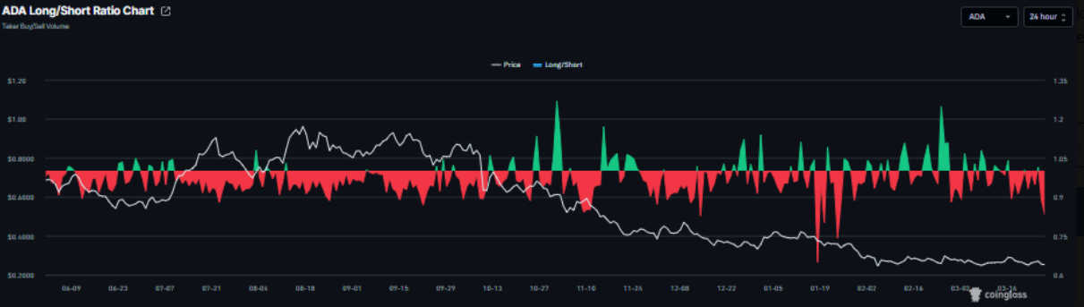 Dữ liệu từ CoinGlass cho thấy tỷ lệ long/short của ADA hiện ở mức 0,83, tiệm cận vùng thấp nhất trong hơn một tháng. Khi tỷ lệ này duy trì dưới ngưỡng 1, điều đó hàm ý phần lớn trader đang nghiêng về kịch bản giá giảm.