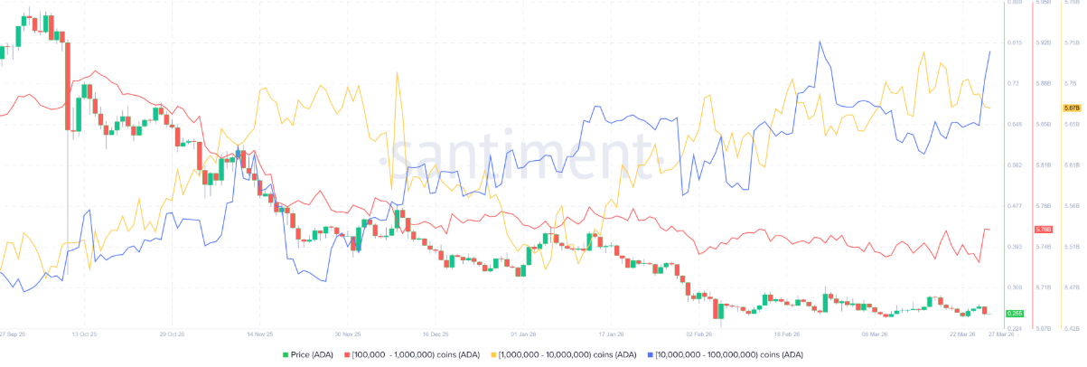 Dù triển vọng ngắn hạn vẫn nghiêng về tiêu cực, dữ liệu on-chain từ Santiment cho thấy một số nhóm cá voi đã bắt đầu quay lại tích lũy ADA. Cụ thể, các ví nắm giữ từ 100.000 đến 1 triệu ADA và từ 10 đến 100 triệu ADA đã mua ròng tổng cộng 270 triệu token trong giai đoạn từ thứ Tư đến thứ Sáu. Trái ngược, nhóm sở hữu từ 1 đến 10 triệu ADA lại bán ra khoảng 20 triệu token.