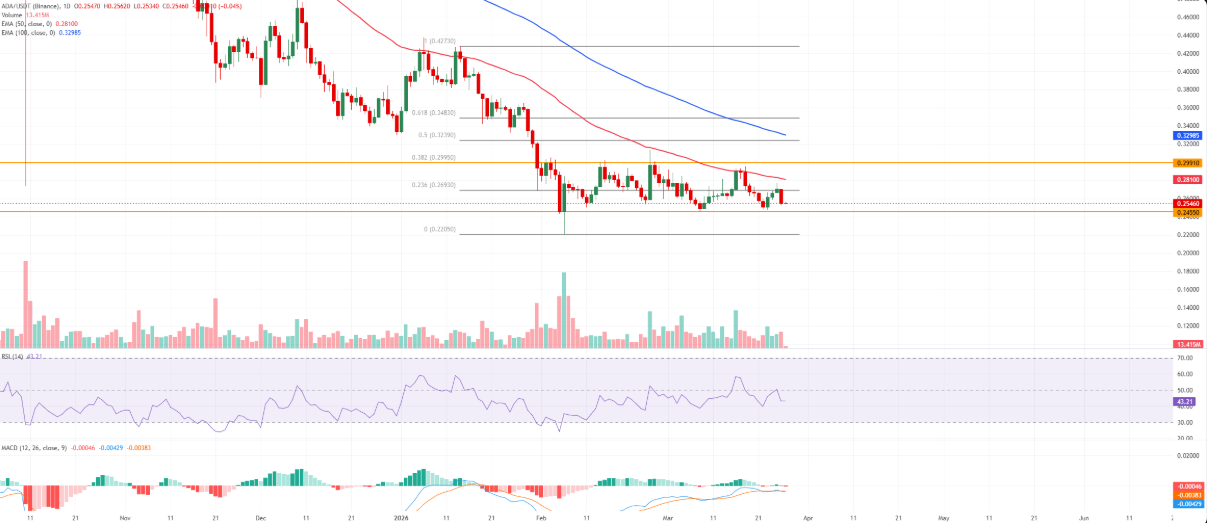 ADA hiện giao dịch dưới 0,27 USD sau khi mất gần 6% trong phiên trước, xóa nhòa phần lớn nỗ lực phục hồi ngắn hạn. Dù xu hướng ngắn hạn có dấu hiệu trung tính, áp lực giảm vẫn chiếm ưu thế khi giá duy trì dưới các đường EMA 50 và 100 ngày.