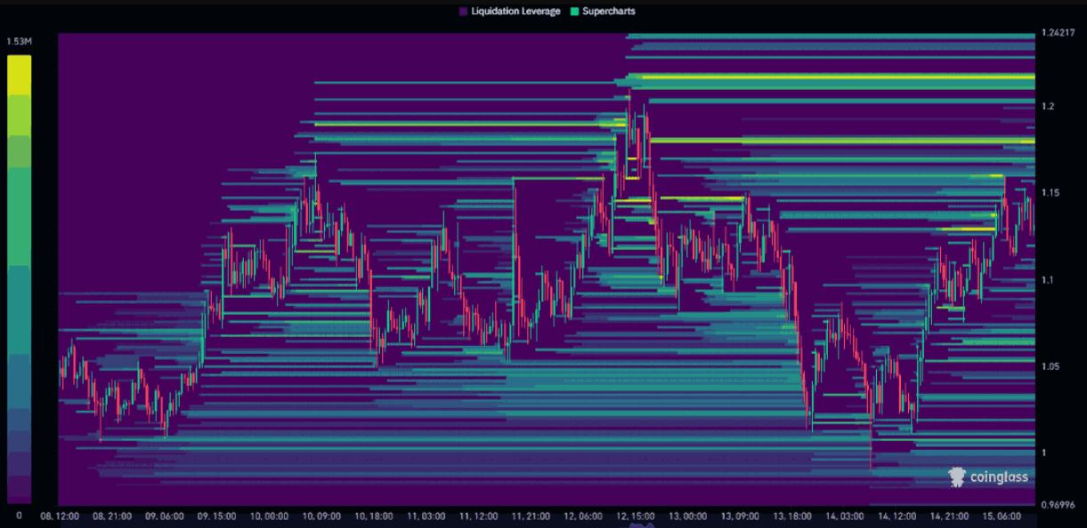 Bản đồ thanh khoản từ CoinGlass ghi nhận một cụm thanh khoản dày đặc ngay phía trên vùng 1,20 USD của Aster — một mốc có thể trở thành mục tiêu hấp dẫn cho các vị thế Long trong ngắn hạn.