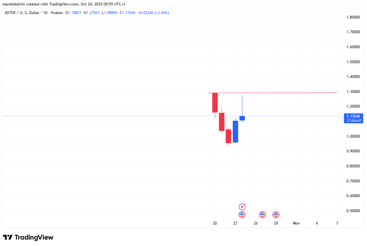 Trên khung ngày, đà tăng của Aster đang dần được định hình, với tâm điểm chú ý hiện tập trung vào vùng kháng cự quan trọng tại 1,3 USD.