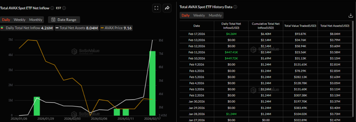 Biểu đồ từ SoSoValue bên dưới cho thấy quỹ VAVX ETF giao ngay của VanEck đã thu hút dòng vốn ròng 4,26 triệu USD trong ngày thứ Ba — mức cao nhất ghi nhận trong một ngày kể từ khi quỹ chính thức ra mắt vào tháng 1. Tuy nhiên, trái ngược với sự quan tâm gia tăng từ khối tổ chức, giá AVAX vẫn gần như “dửng dưng”, không cho thấy phản ứng tích cực tương xứng. Diễn biến này cho thấy áp lực bán vẫn đang đè nặng lên thị trường, đồng thời phản ánh tâm lý thận trọng và sự thiếu niềm tin rõ rệt từ phía các trader.
