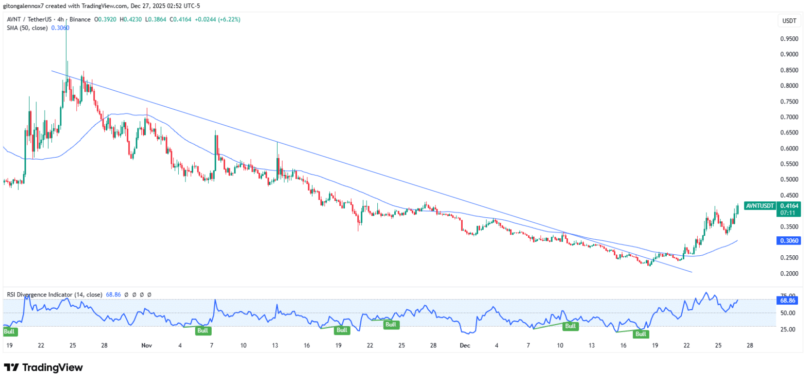 Kể từ cú bứt phá vào ngày 19/12, AVNT liên tục thiết lập các đỉnh cao hơn và đáy cao hơn, phản ánh sự kiểm soát ngày càng rõ nét của phe bò. Đáng chú ý, altcoin này đã bật tăng trở lại từ mốc 0,32 USD trong ngày Giáng Sinh, duy trì vững vàng phía trên đường SMA 50.
