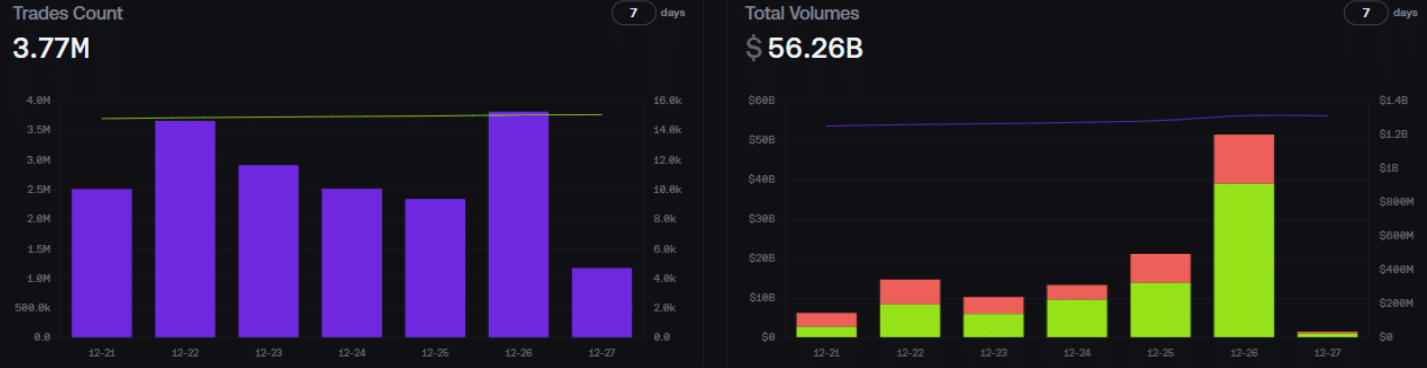 Theo dữ liệu từ Avantis Analytics, hoạt động giao dịch đã ghi nhận sự bùng nổ mạnh mẽ khi tổng số giao dịch trong tuần chạm đỉnh 3,77 triệu vào ngày Boxing Day. Riêng trong ngày này, thị trường ghi nhận khoảng 15.272 giao dịch, phản ánh mức độ quan tâm ngày càng gia tăng của nhà đầu tư.