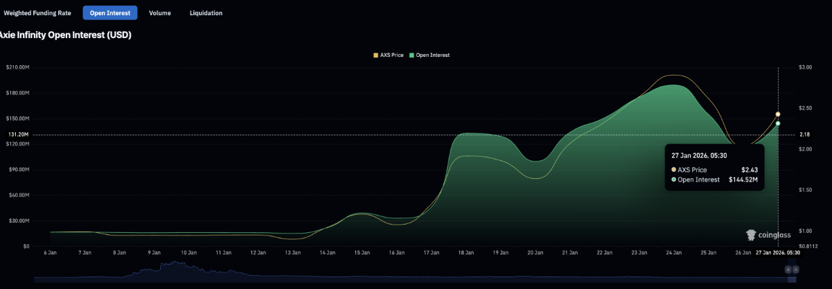 Ở mảng phái sinh, sự ra mắt của bAXS đã nhanh chóng thổi luồng sinh khí mới vào các hợp đồng tương lai AXS. Hợp đồng mở vọt lên mức đỉnh 189,52 triệu USD vào thứ Bảy, tăng mạnh so với chưa đầy 14 triệu USD ghi nhận vào ngày 1/1. Tại thời điểm viết bài, OI của AXS vẫn duy trì ở mức 144,52 triệu USD, tương đương giai đoạn cao điểm hồi tháng 5/2022. Đà gia tăng giá trị danh nghĩa của các hợp đồng đang lưu hành cho thấy niềm tin của nhà đầu tư đối với token game này đang dần được củng cố.