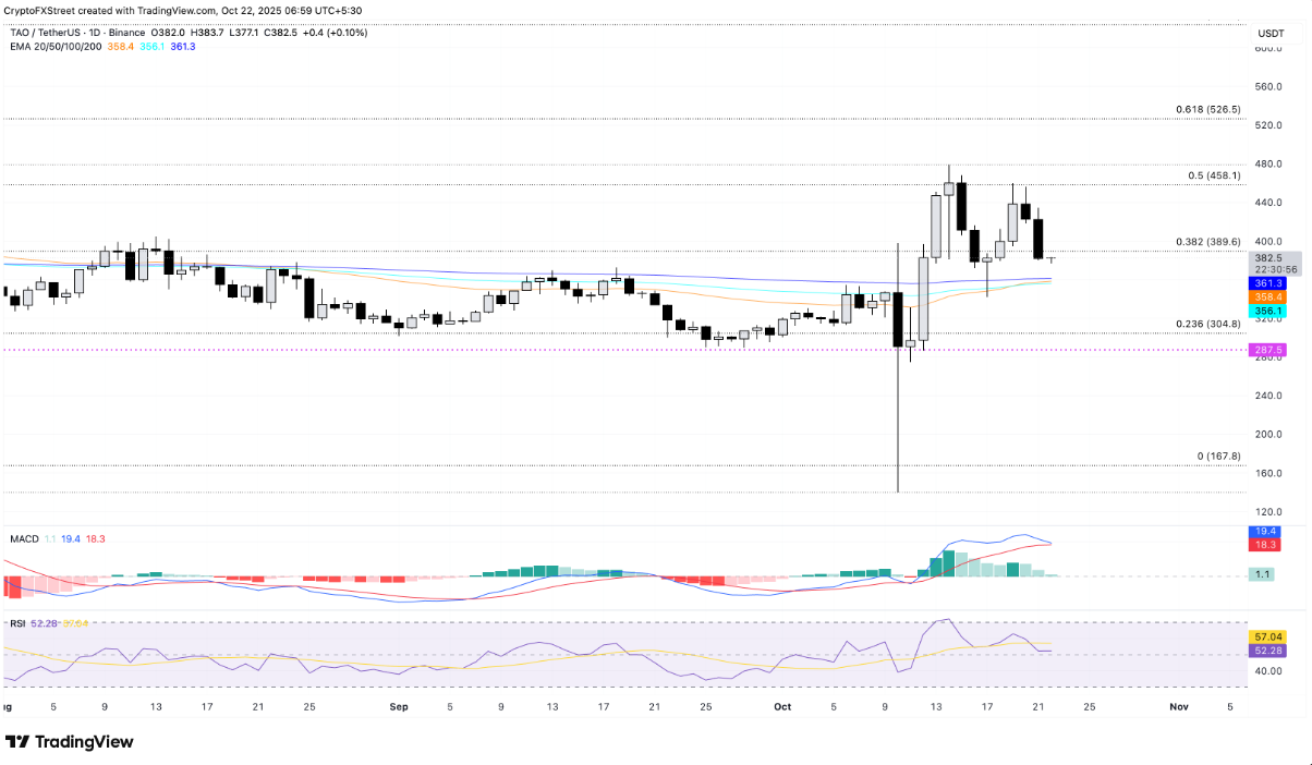 Vùng 361 USD hiện đóng vai trò là hỗ trợ then chốt, nơi hội tụ của các đường EMA 50, 100 và 200 ngày. Nếu mốc này bị xuyên thủng, TAO có thể mở rộng đà giảm về vùng 304 USD, tương ứng với mức Fibonacci thoái lui 23,6%.