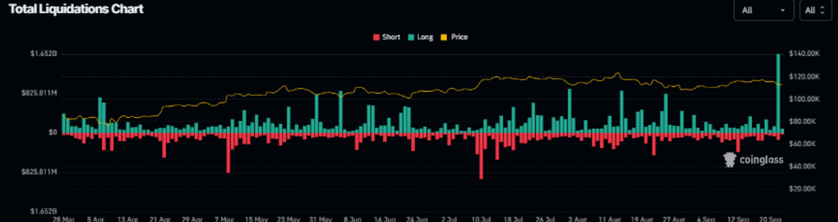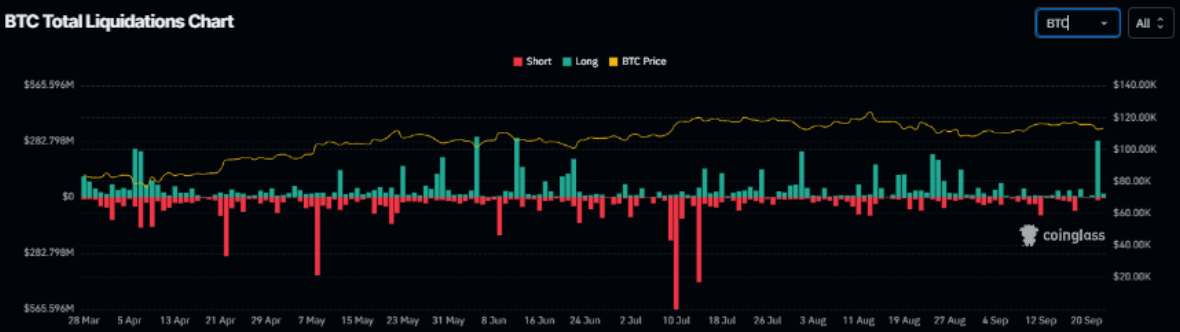 Riêng với Bitcoin, mức thanh lý trong ngày đạt đỉnh kể từ giữa tháng 6, với 285,92 triệu USD vị thế Long bị xóa sổ, so với chỉ 15,14 triệu USD Short. Động thái này đã cuốn phăng phần lớn các khoản đặt cược dựa trên đòn bẩy quá mức.