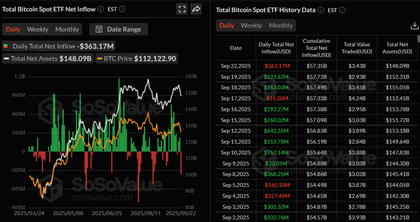 Theo số liệu từ SoSoValue, các quỹ Bitcoin ETF giao ngay đã ghi nhận dòng vốn rút ròng 368,17 triệu USD trong ngày thứ Hai – mức cao nhất trong một phiên kể từ giữa tháng 8.