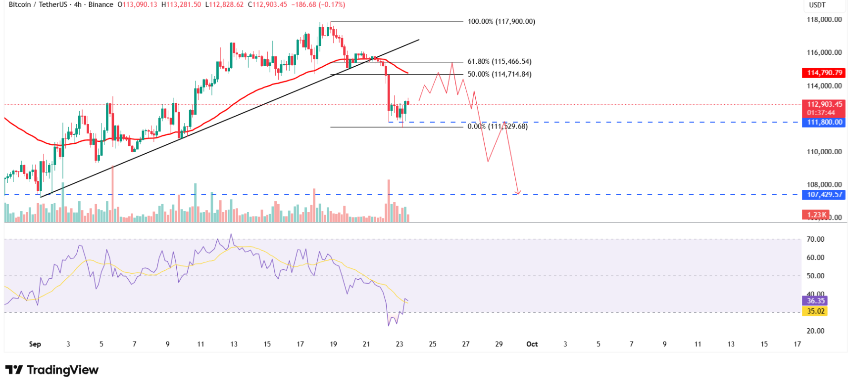 Trên khung 4 giờ, Bitcoin đã đánh mất đà tăng khi phá vỡ đường xu hướng nối các đáy từ đầu tháng 9 vào Chủ Nhật, đồng thời đóng cửa dưới đường EMA 50 kỳ. Bước sang đầu tuần, đà giảm tiếp diễn với mức mất 2,24% trong ngày thứ Hai. Tính đến tối thứ Ba, BTC có nhịp hồi nhẹ, giao dịch quanh 112.900 USD.