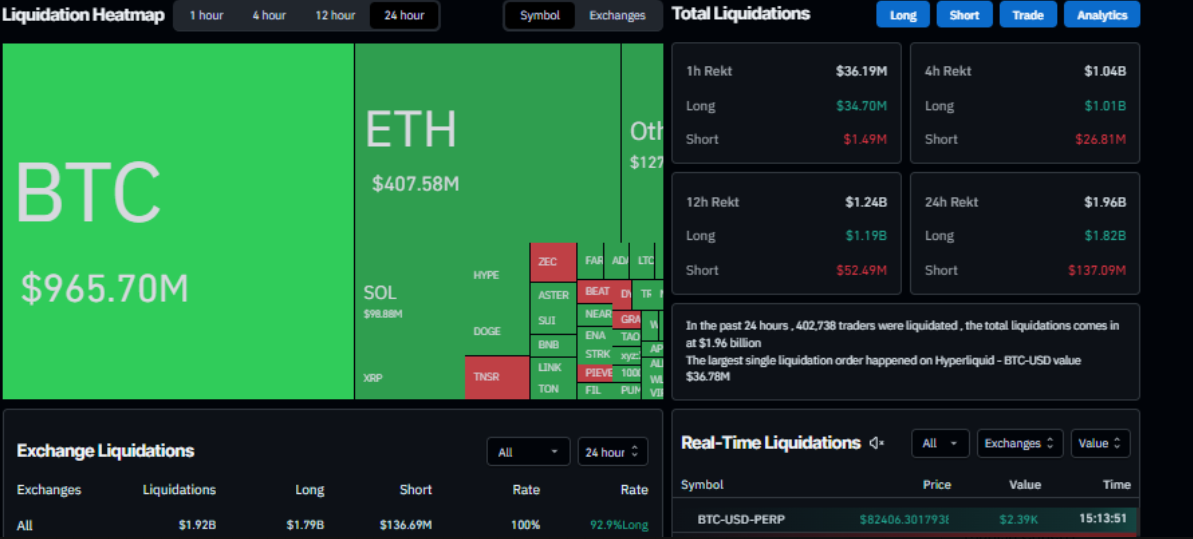 Chỉ trong 24 giờ qua, 402.738 trader đã bị thanh lý với tổng giá trị hơn 1,96 tỷ USD, trong đó hơn 92% là các vị thế Long — phản ánh tâm lý lạc quan thái quá trước đó của thị trường. Thương vụ thanh lý lớn nhất diễn ra trên Hyperliquid, với cặp BTC/USD trị giá 36,78 triệu USD.