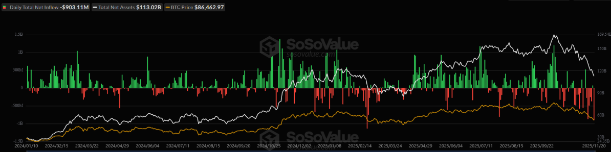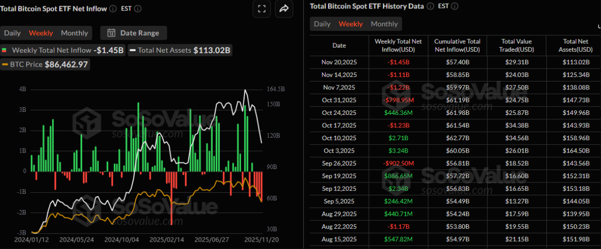 Đà giảm của Bitcoin tiếp tục bị khoét sâu bởi sự suy yếu rõ rệt trong nhu cầu từ các nhà đầu tư tổ chức, khi các Bitcoin ETF giao ngay ghi nhận dòng vốn rút ròng 1,45 tỷ USD trong tuần này — đánh dấu bốn tuần liên tiếp chứng kiến dòng tiền chảy ra kể từ cuối tháng 10.