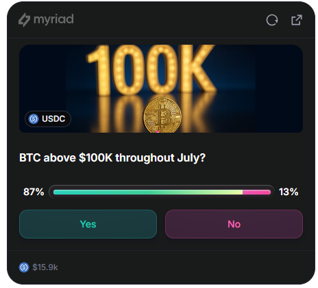 Trader trên thị trường dự đoán Myriad đang rất lạc quan về xu hướng tăng này. Hiện tại, người dùng Myriad đánh giá xác suất Bitcoin không giảm xuống dưới 100.000 đô la trong suốt tháng 7 là 87%. Đây gần như là một “kèo chắc ăn” khi xác suất Bitcoin giữ trên mức 109.000 đô la vào cuối tuần đạt đến 90%, với mức tăng xác suất lên đến 40% chỉ trong một đêm.