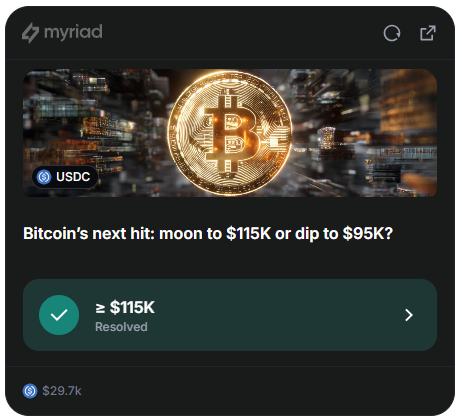 Tương tự, người dùng Myriad còn tin chắc hơn rằng Bitcoin sẽ đạt mốc 115.000 đô la trước khi có thể giảm xuống 95.000đô la, với xác suất tăng từ 69% lên 87% chỉ trong ngày qua.