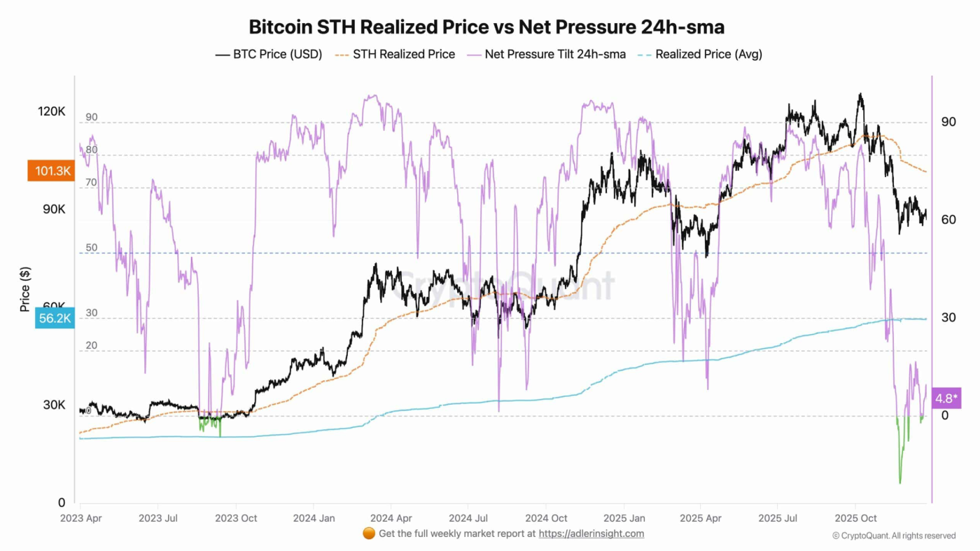 Nhà phân tích Axel Adler Jr bổ sung rằng thị trường của trader ngắn hạn đang bước vào một trạng thái cân bằng áp lực hiếm gặp. Chỉ số liên quan đã rơi xuống nhóm 5% thấp nhất trong phân bố dữ liệu, cho thấy lực mua và bán giữa các holder ngắn hạn gần như ngang bằng. Hiện tượng này chỉ xuất hiện trong khoảng 5,8% số quan sát trong ba năm qua, phản ánh sự lưỡng lự của thị trường khi tìm kiếm định hướng tiếp theo.